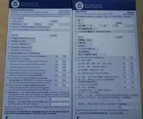 在飞往美国的飞机上,空姐会派发一张蓝色的表格,这张表格即是美国海关的入境申报表,主要作用是来检查旅客的行李,请按照实际情况来填写表格。